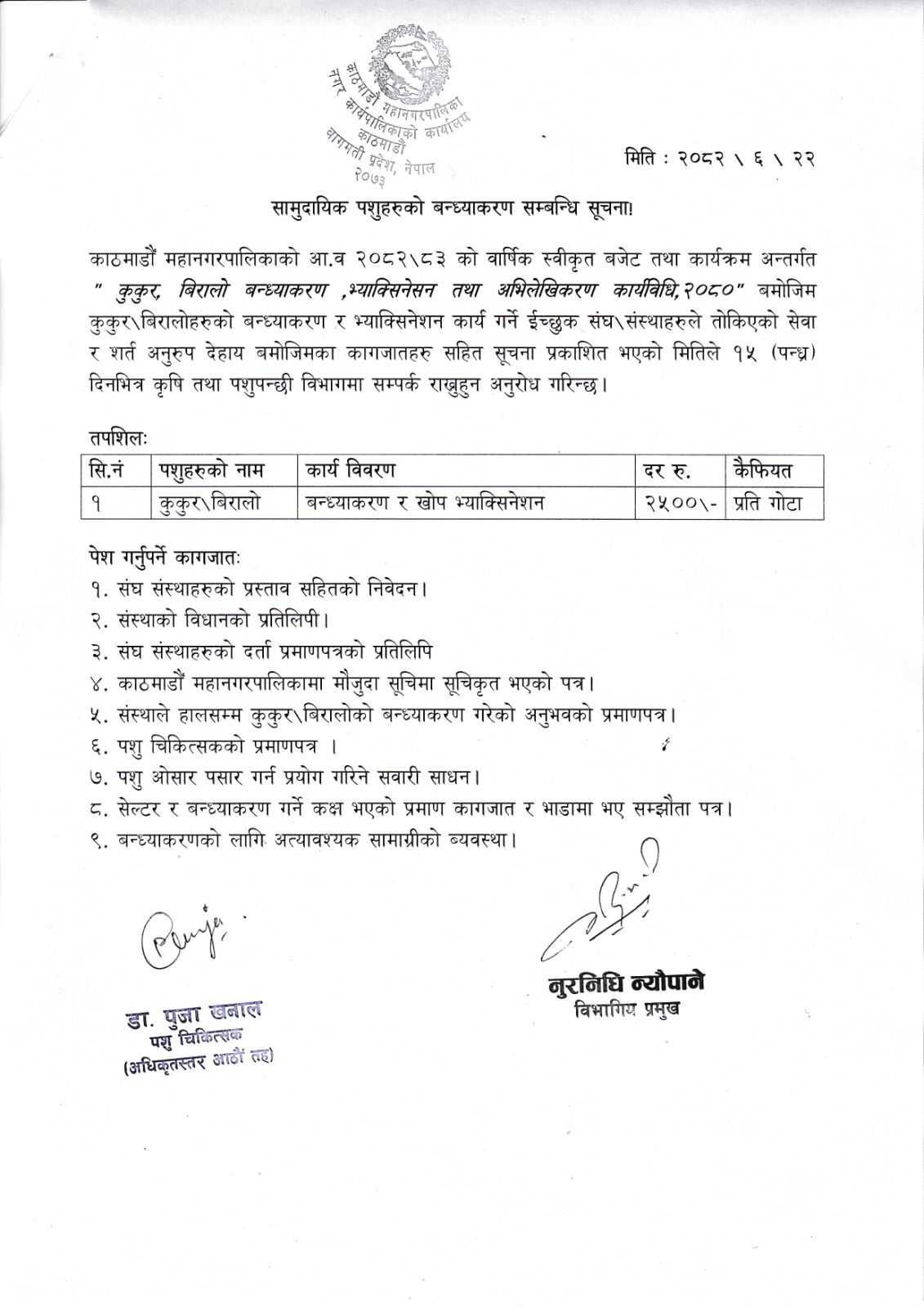 इच्छुक संस्थाले १५ दिनभित्र महानगरको कृषि तथा पशुपन्छी विभागमा सम्पर्क गरी आवेदन पेस गर्नुपर्ने जनाएको छ । महानगरले बन्ध्याकरण तथा खोप भ्याक्सिनेसनको दर प्रति गोटा २ हजार ५ सय रुपैयाँ तोकेको छ ।