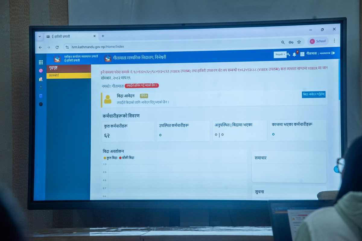 काठमाडौँ । काठमाडौँ महानगरपालिकाले सबै सामुदायिक विद्यालयहरुलाई एकीकृत हाजिरी प्रणालीमा आवद्ध गराएको छ । यो प्रणालीमा महानगरपालिकाका कर्मचारी, विद्यालयका शिक्षक, कर्मचारी र विद्यार्थीको दैनिक हाजिरी हुनेछ । माघ १३ गते कार्यवाहक प्रमुख सुनिता डंगोलले ७ दिनभित्र विदालयका शिक्षक, कर्मचारी र विद्यार्थीहरुलाई डिजिटल हाजिरी प्रणालीमा आवद्ध गराउन निर्देशन दिएपछि शिक्षा विभाग र सूचना प्रविधि विभागले आफ्नै प्रणाली विकास गरेर सबै सामुदायिक विद्यालयलाई प्रणालीमा जोडेका हुन् ।