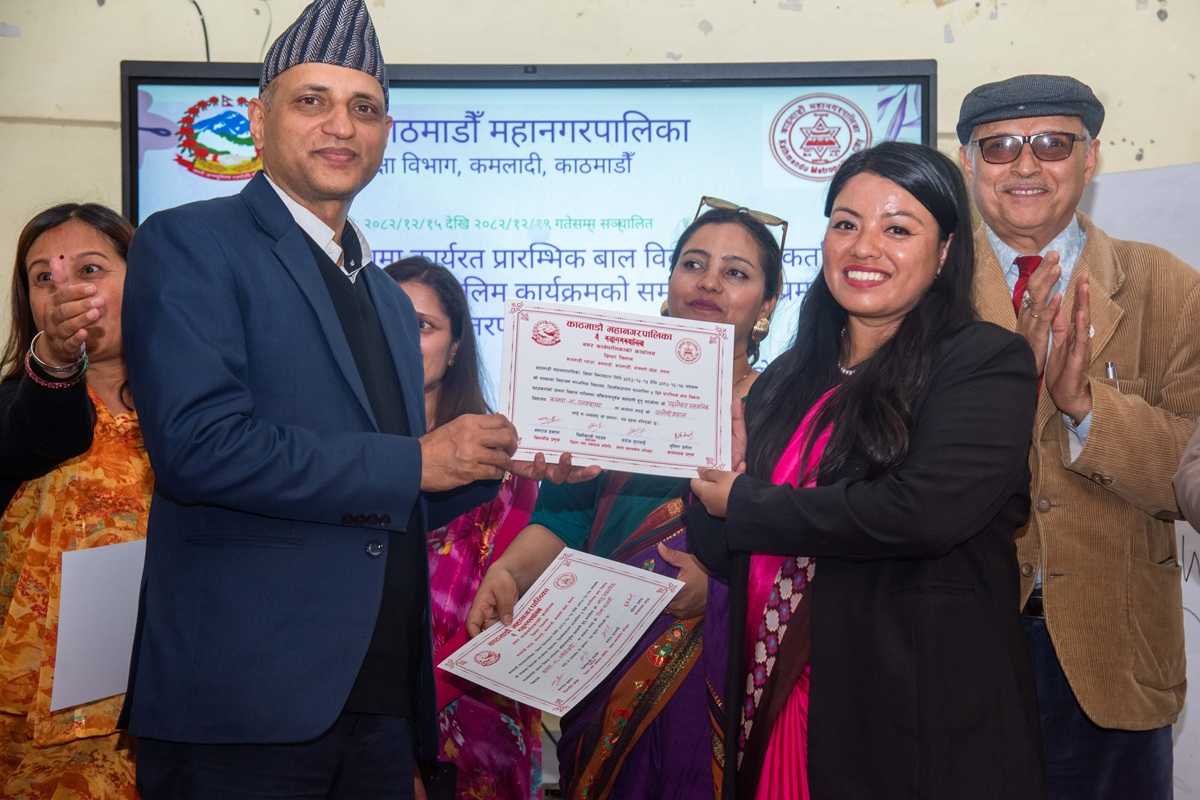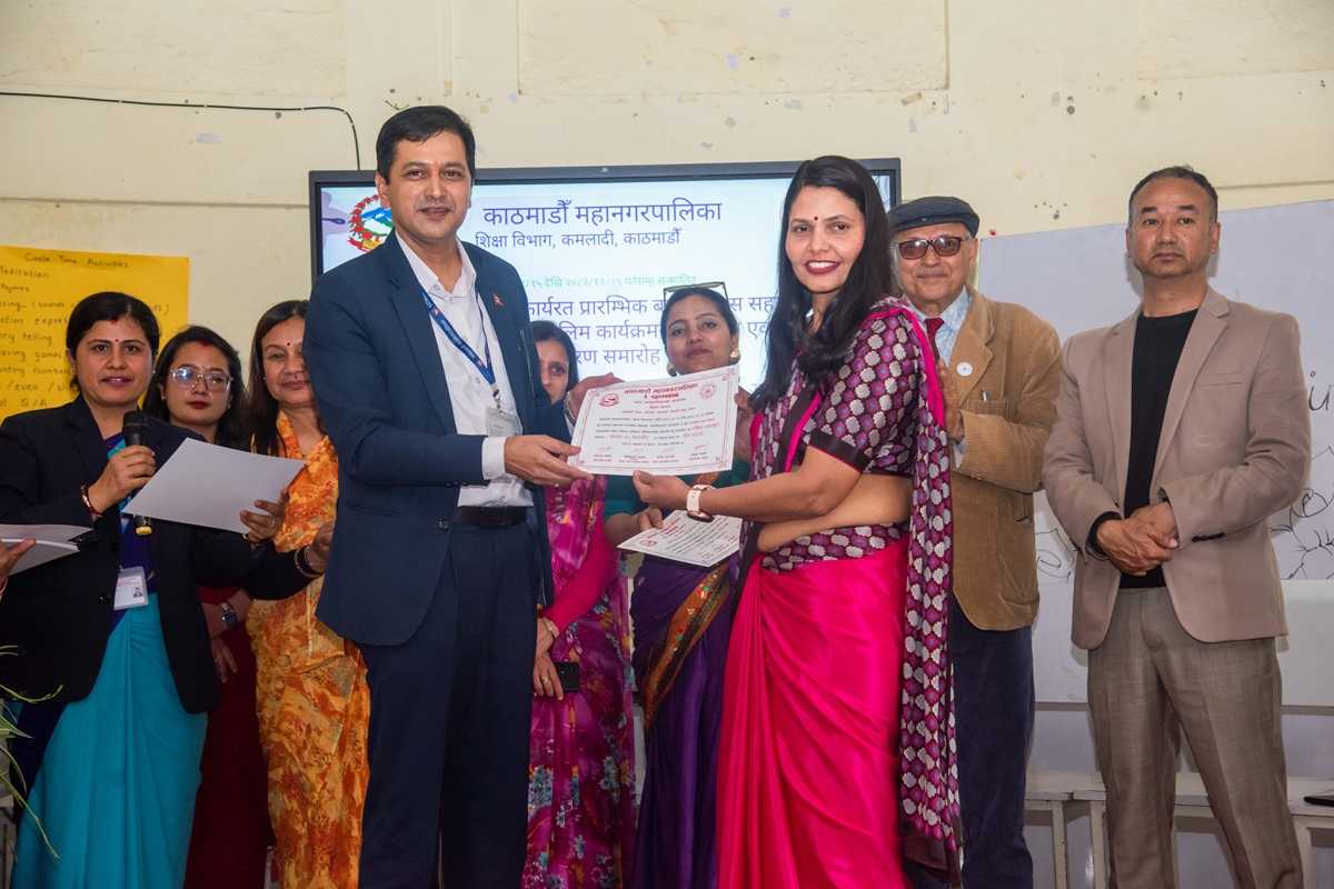 काठमाडौँ । काठमाडौँ महानगरपालिकाले बाल विकास सहजकर्ताका लागि ५ दिने क्षमता विकास तालिमको पहिलो चरण सम्पन्न गरेको छ । चैत १५ गतेदेखि पद्मकन्या विद्याश्रम माध्यमिक विद्यालय डिल्लीबजारमा सञ्चालन भएको यस चरणको तालिम आज समापन गरिएको हो । तालिममा नेपाल सरकार, पाठ्यक्रम विकास केन्द्रले तर्जुमा गरेको प्रारम्भिक बाल विकास र शिक्षा पाठ्यक्रममा आधारित क्षमता विकास तालिम गराइएको हो । पहिलो चरणमा महानगरपालिकाको आन्तरिक स्रोतबाट नियुक्त भएका ५७ जना सहजकर्ता सहभागी हुनुभएको थियो । दोस्रो चरणको तालिम चैत २२ गतेदेखि प्रारम्भ हुनेछ ।