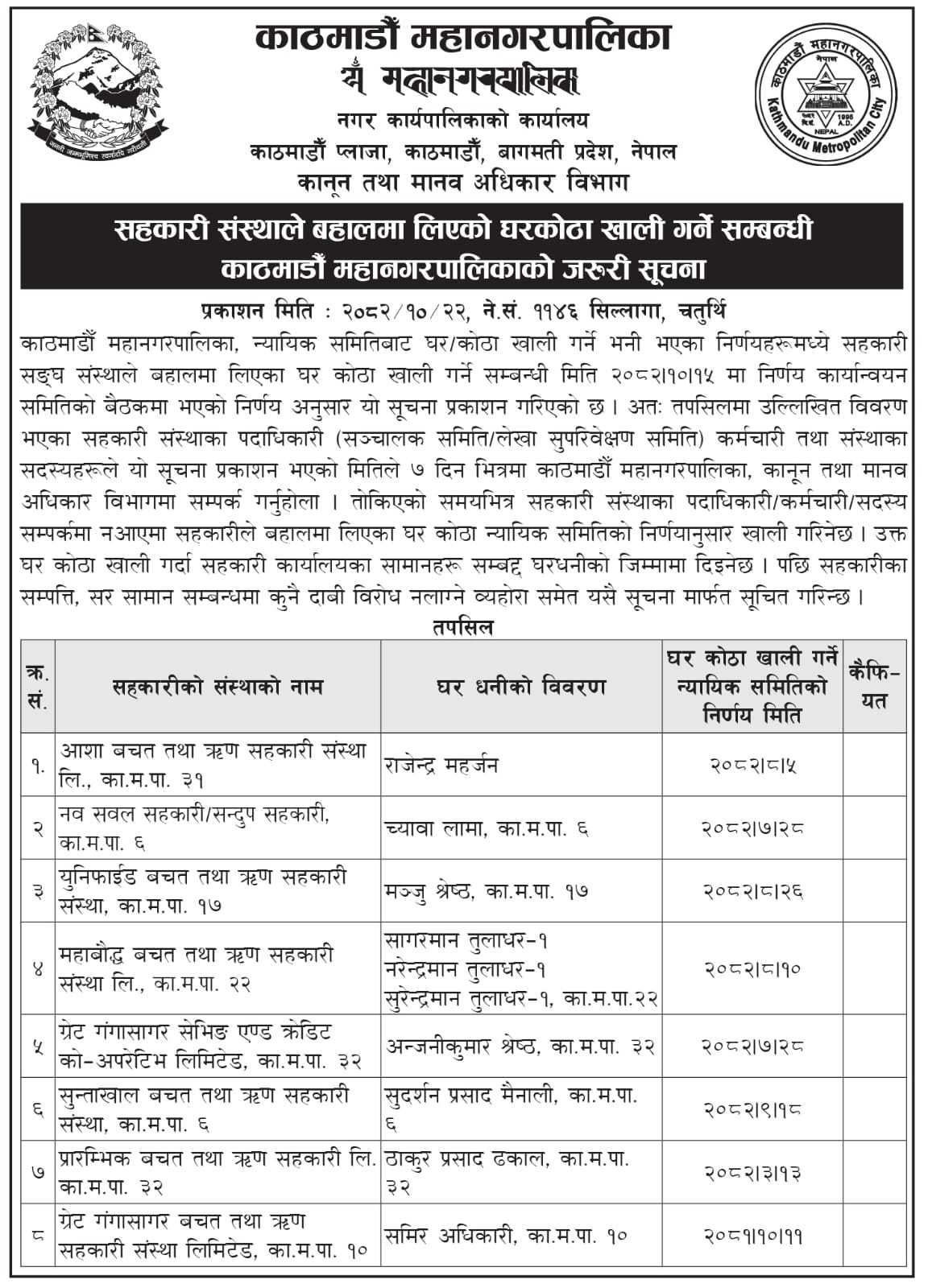 ‘सूचनामा विवरण भएका सहकारी संस्थाका पदाधिकारी (सञ्चालक समिति, लेखा सुपरीेक्षण समिति) कर्मचारी तथा संस्थाका सदस्यहरूले यो सूचना प्रकाशन भएको मितिले ७ दिन भित्रमा काठमाडौँ महानगरपालिका, कानून तथा मानव अधिकार विभागमा सम्पर्क गर्नुहोला । तोकिएको समयभित्र सहकारी संस्थाका पदाधिकारी, कर्मचारी, सदस्य सम्पर्कमा नआएमा सहकारीले बहालमा लिएका घर कोठा न्यायिक समितिको निर्णयानुसार खाली गरिनेछ ।’ सूचनामा भनिएको छ, ‘उक्त घर कोठा खाली गर्दा सहकारी कार्यालयका सामानहरू सम्बद्ध घरधनीको जिम्मामा दिइनेछ । पछि सहकारीका सम्पत्ति, सरसामान सम्बन्धमा कुनै दाबी विरोध नलाग्ने व्यहोरा समेत यसै सूचना मार्फत सूचित गरिन्छ ।’