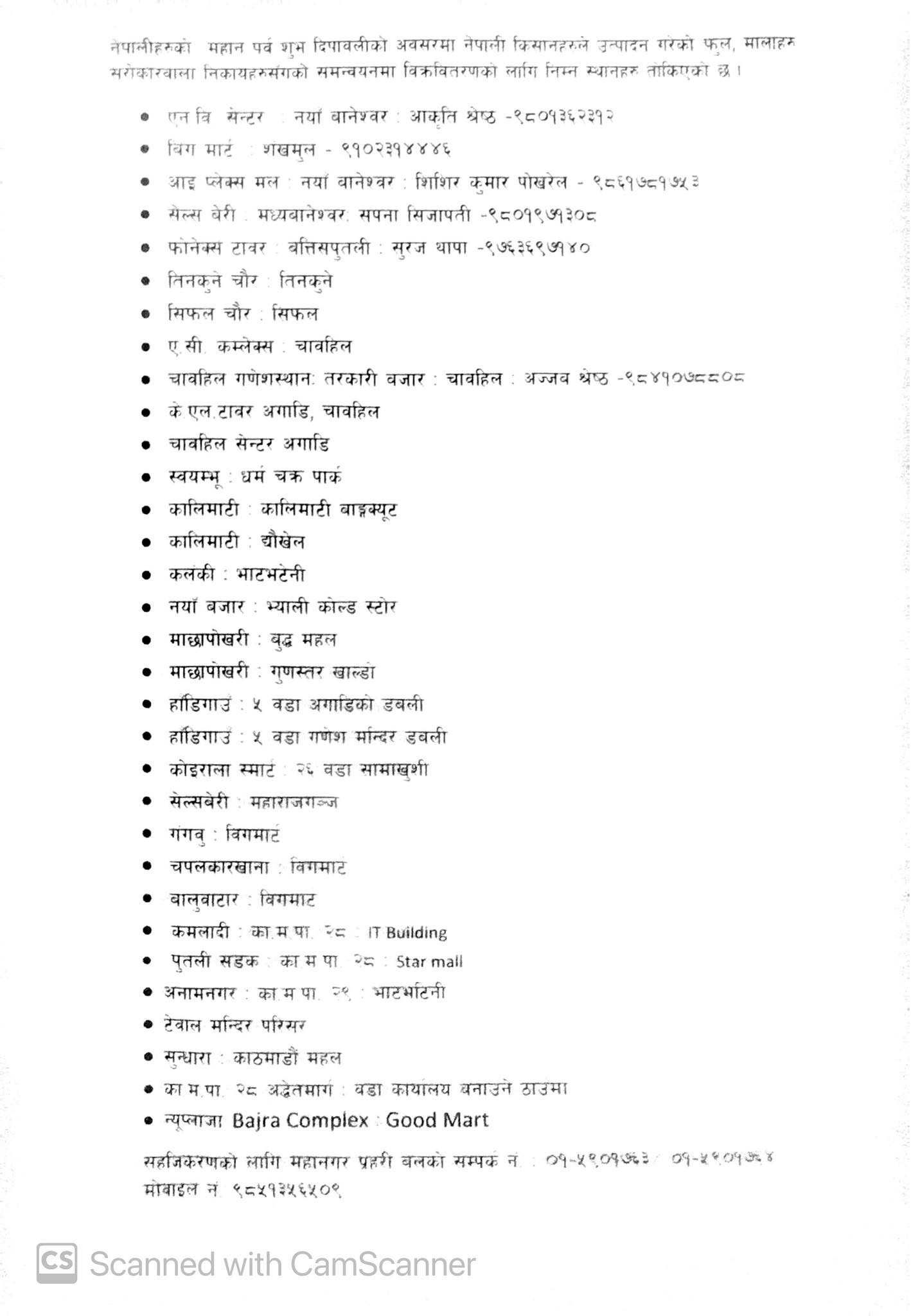फूलमाला बिक्री–वितरणका लागि काठमाडौँ महानगरपालिकाले तोकेका ३२ स्थानहरू निम्न छन्: