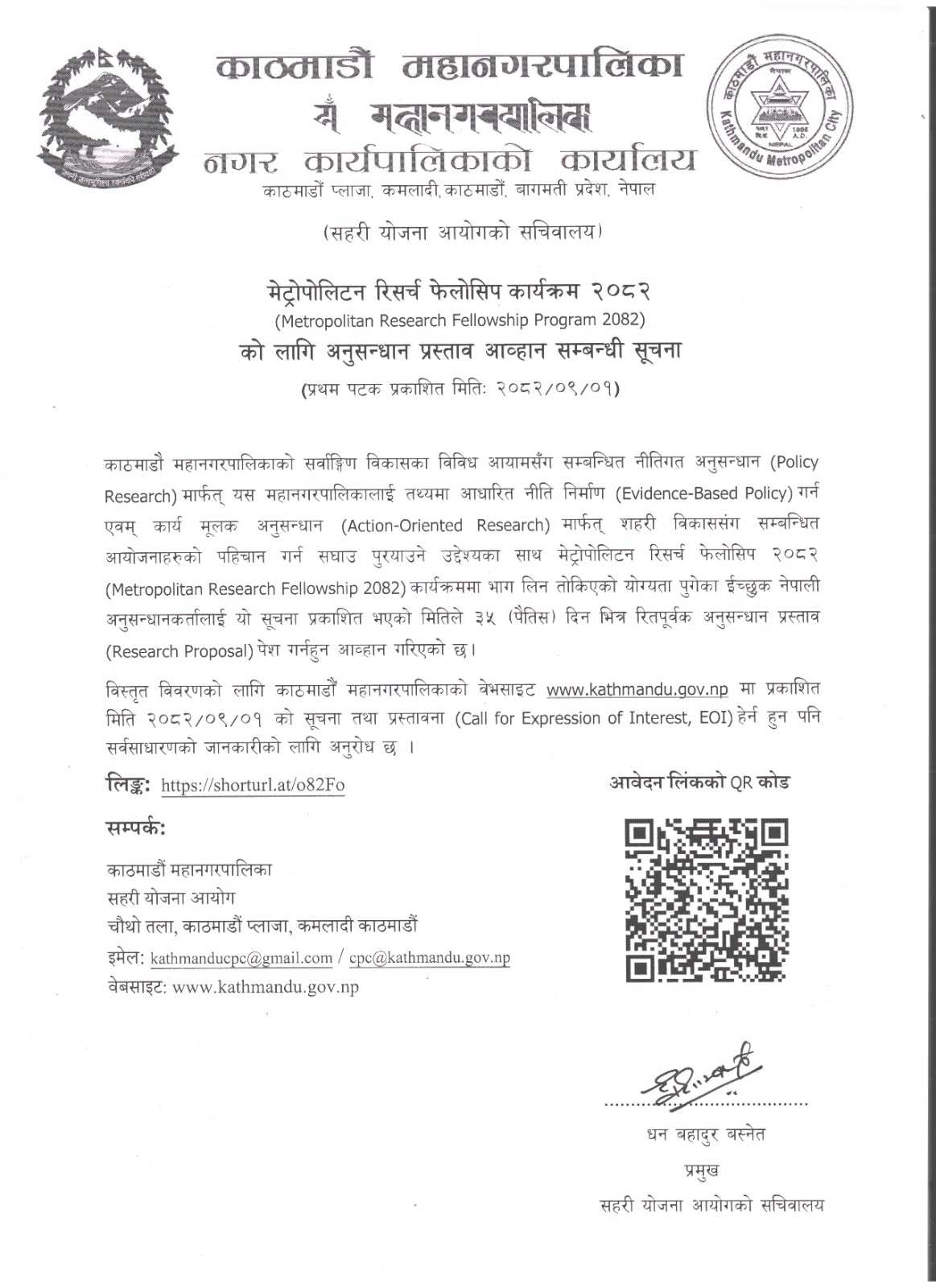 काठमाडौँ । ‘महानगर अनुसन्धान शोधवृत्ति’का लागि काठमाडौँ महानगरपालिकाले १० वटा विषयमा शोधकर्तालाई आव्हान गरेको छ । अनुसन्धानको परिणामसँग नीतिगत निर्णयको सम्बन्ध, कार्यान्वयन वा उपयोगिता, पूर्वाधार तथा सामाजिक विकासमा आधारित परिणाम, आवश्यकतामा आधारित परियोजना जस्ता विषयलाई प्राथमिकतामा राखेर यस बर्ष अध्ययनका विषय छनोट भएका हुन् ।