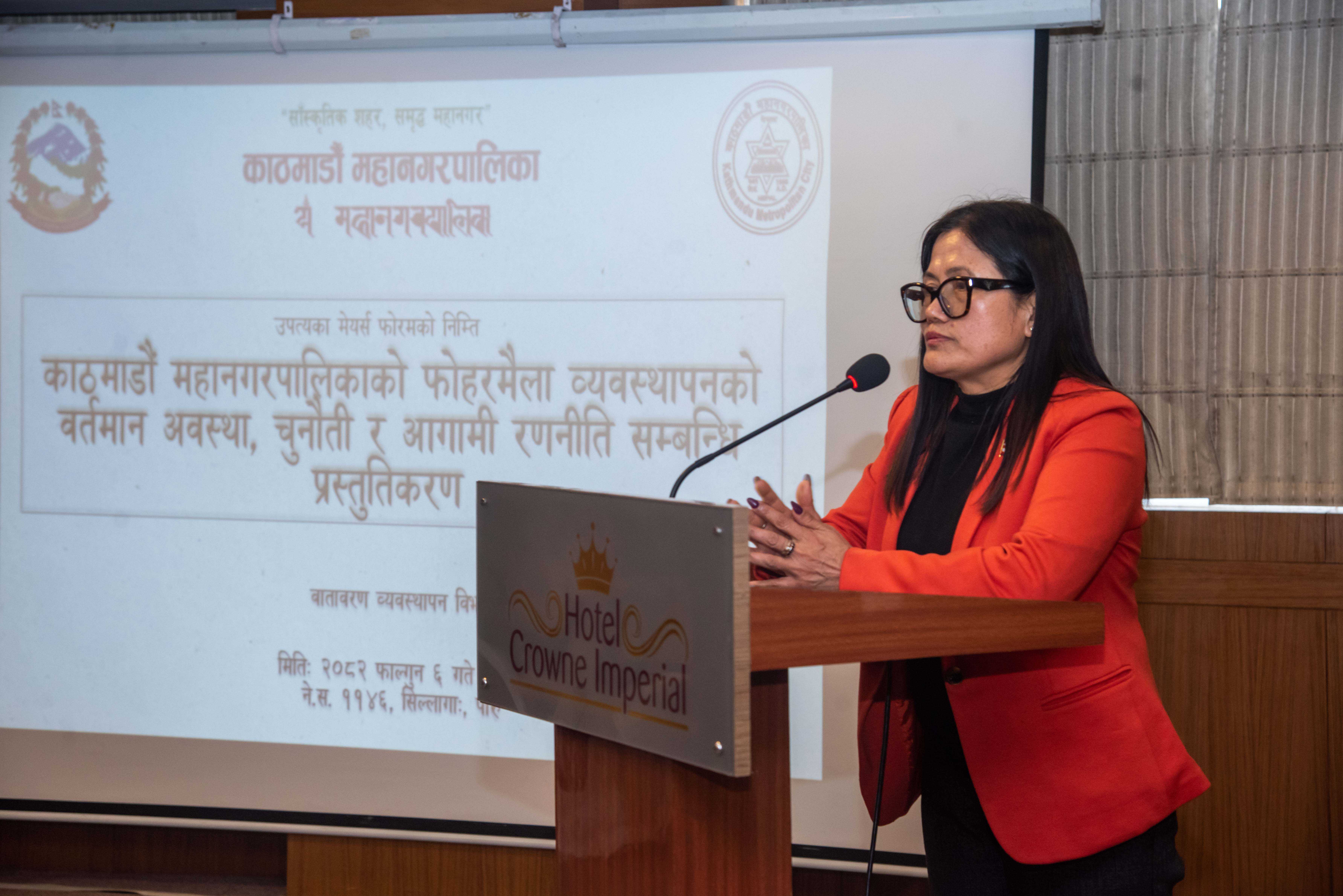 बैठक प्रारम्भ हुनुअघि काठमाडौँ महानगरपालिकाका तर्फबाट वातावरण व्यवस्थापन विभागका प्रमुख सरिता राईले फोहर संकलन, ढुवानी र अन्तिम व्यवस्थापनमा विद्यमान अवस्था र दिगोपनाका लागि अवको आवश्यकता विषयमा प्रस्तुतिकरण गर्नुभएको थियो । यसमा पनि ल्याण्डफिल साइट क्षेत्रको व्यवस्थापन र यसमा स्थानीय तहको जिम्मेवारीमा केन्द्रीत गरिएको थियो । ल्याण्डफिल साइटमा काठमाडौँसहित विभिन्न ६ वटा जिल्लाका २४ वटा पालिकाबाट फोहरको अन्तिम व्यवस्थापन कार्य गरिँदै आएको छ । ढुवानी नगरपालिका र निजी क्षेत्रबाट हुने गरेको छ भने साइट व्यवस्थापनको काम काठमाडौँ महानगरपालिकाले गर्ने गरेको छ ।